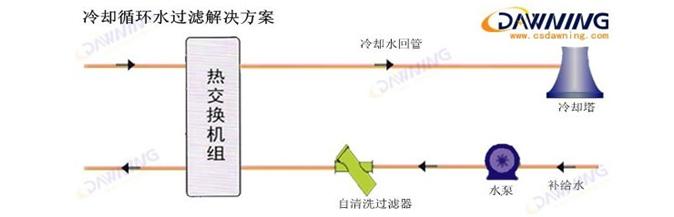 我們?yōu)槠涮峁┑倪^(guò)濾解決方案將徹底解決這一問(wèn)題,如上面流程圖所示,我們?cè)谒煤蛽Q熱器之間設(shè)備一臺(tái)自清洗過(guò)濾器(電動(dòng)刷式過(guò)濾器或電動(dòng)式自動(dòng)排污過(guò)濾器),根據(jù)現(xiàn)場(chǎng)實(shí)際情況,選擇相應(yīng)的過(guò)濾網(wǎng)和過(guò)濾精度,這些將保證在不影響水系統(tǒng)正常運(yùn)行的狀況下,自清洗過(guò)濾器會(huì)過(guò)濾掉符合精度的所有雜質(zhì),并在設(shè)定的壓差或時(shí)間范圍內(nèi)自動(dòng)清洗濾網(wǎng)、自動(dòng)排污。自清洗過(guò)濾器的設(shè)置,將大大提高系統(tǒng)的換熱效率、減少系統(tǒng)補(bǔ)水量、提高水的濃縮比,達(dá)到節(jié)水、節(jié)能、環(huán)保的目的。